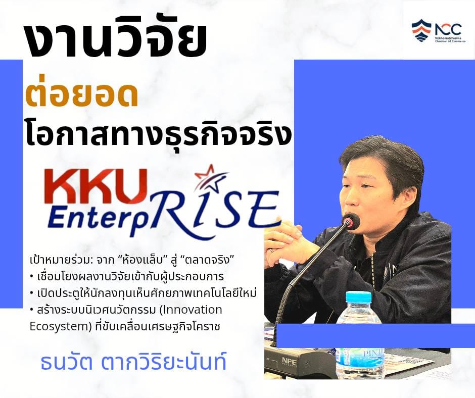 วันนี้หอการค้าโคราชจับมือมหาวิทยาลัยขอนแก่น เชื่อมโลกวิชาการกับโลกธุรกิจ สร้างพลังใหม่ให้เศรษฐกิจอีสาน วันพฤหัสบดีที่ 30 ตุลาคม 2568 ณ หอการค้าจังหวัดนครราชสีมาหอการค้าจังหวัดนครราชสีมาโดย ดร.ธีรพงศ์ คณาศักดิ์ รองประธานฝ่ายบริหารและสื่อสารองค์กร พร้อมด้วยดร.สุดาพร สุวัฒโนดม กรรมการฝ่ายต่างประเทศและการลงทุนและ นายธนวัต ตากวิริยะนันท์ กรรมการฝ่ายกิจกรรมภาครัฐ ได้ทำการต้อนรับ รศ.ดร.เพ็ญศรี เจริญวานิชรองอธิการฝ่ายกิจการนักศึกษาและนวัตวณิชย์ มหาวิทยาลัยขอนแก่น ผศ.ดร.ปิยดา ดาวดึงษ์ รักษาการผู้อำนวยการ KKU Enterprise เข้าพบคณะกรรมการหอการค้าฯ เพื่อร่วม นำเสนองานวิจัยและทรัพย์สินทางปัญญา (IP)ของมหาวิทยาลัยขอนแก่น ให้ภาคธุรกิจและนักลงทุนในโคราช สามารถ ต่อยอดเชิงพาณิชย์ได้จริง เป้าหมายร่วม: จาก “ห้องแล็บ” สู่ “ตลาดจริง”• เชื่อมโยงผลงานวิจัยเข้ากับผู้ประกอบการ• เปิดประตูให้นักลงทุนเห็นศักยภาพเทคโนโลยีใหม่• สร้างระบบนิเวศนวัตกรรม (Innovation Ecosystem) ที่ขับเคลื่อนเศรษฐกิจโคราช หอการค้าโคราช เรามุ่งผลักดันให้โคราชก้าวสู่ศูนย์กลางเศรษฐกิจเชิงสร้างสรรค์ โดยใช้ “งานวิจัย + ธุรกิจ + การลงทุน” เป็นเครื่องยนต์สำคัญ เพื่อยกระดับศักยภาพผู้ประกอบการในภูมิภาคอีสานให้เติบโตอย่างยั่งยืน