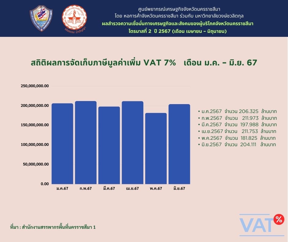 จากข้อมูลชี้ให้เห็นว่าในครึ่งปีแรกของปี พ.ศ. 2567แต่ละเดือนการจัดเก็บภาษีมูลค่าเพิ่มของสำนักงานสรรพากรพื้นที่นครราชสีมา 1 มีมูลค่าที่ใกล้เคียงกัน และมีแนวโน้มเพิ่มเล็กน้อย
