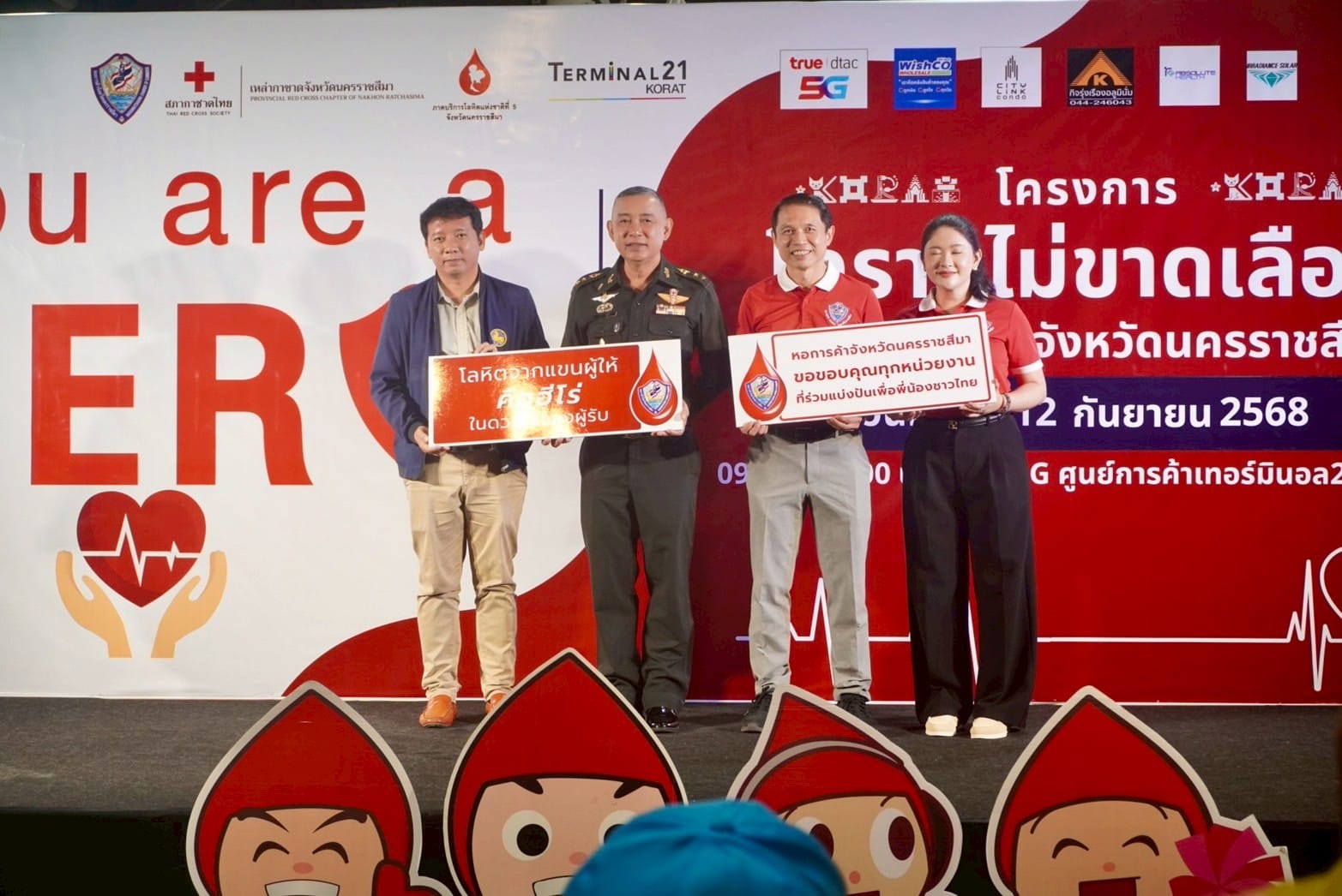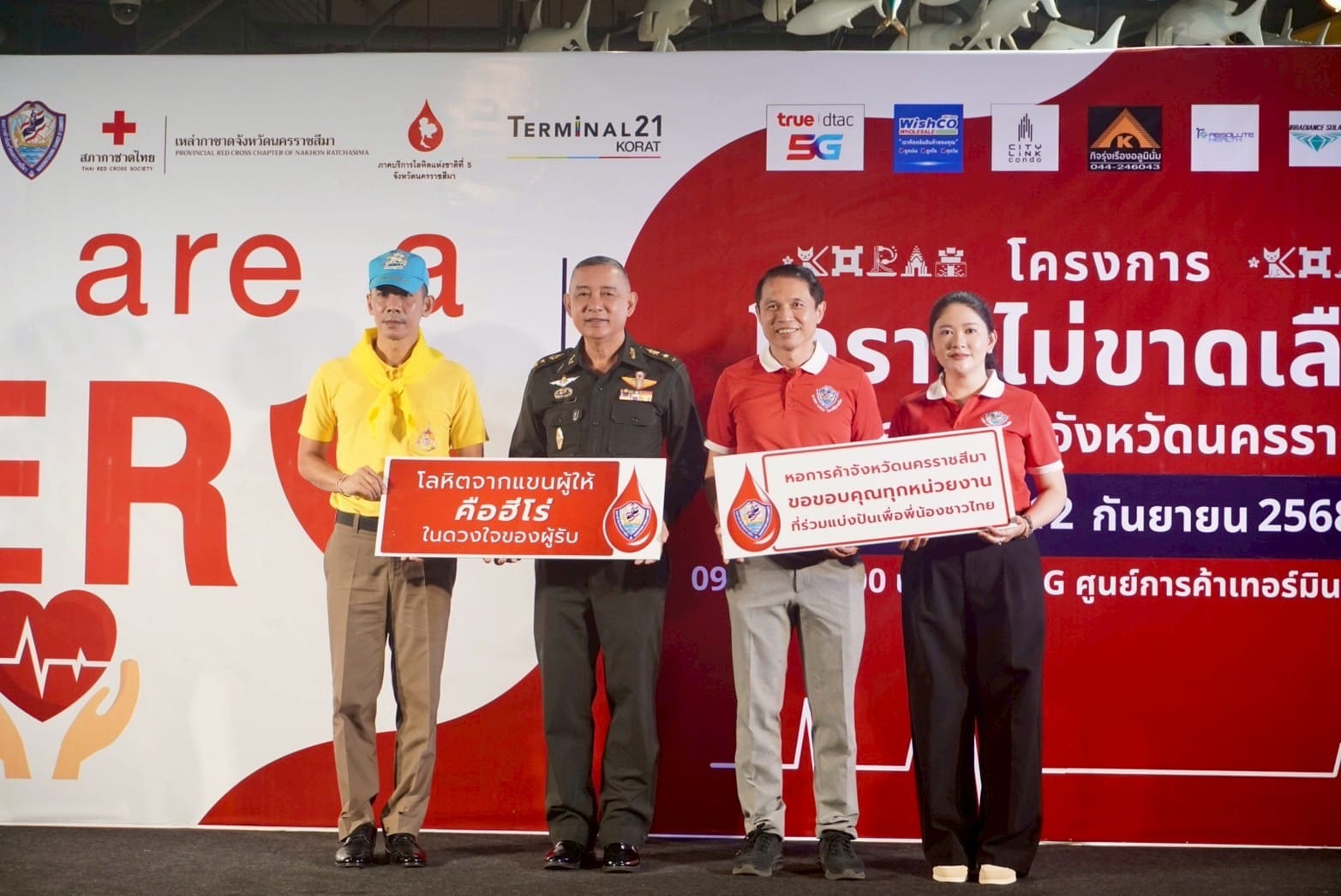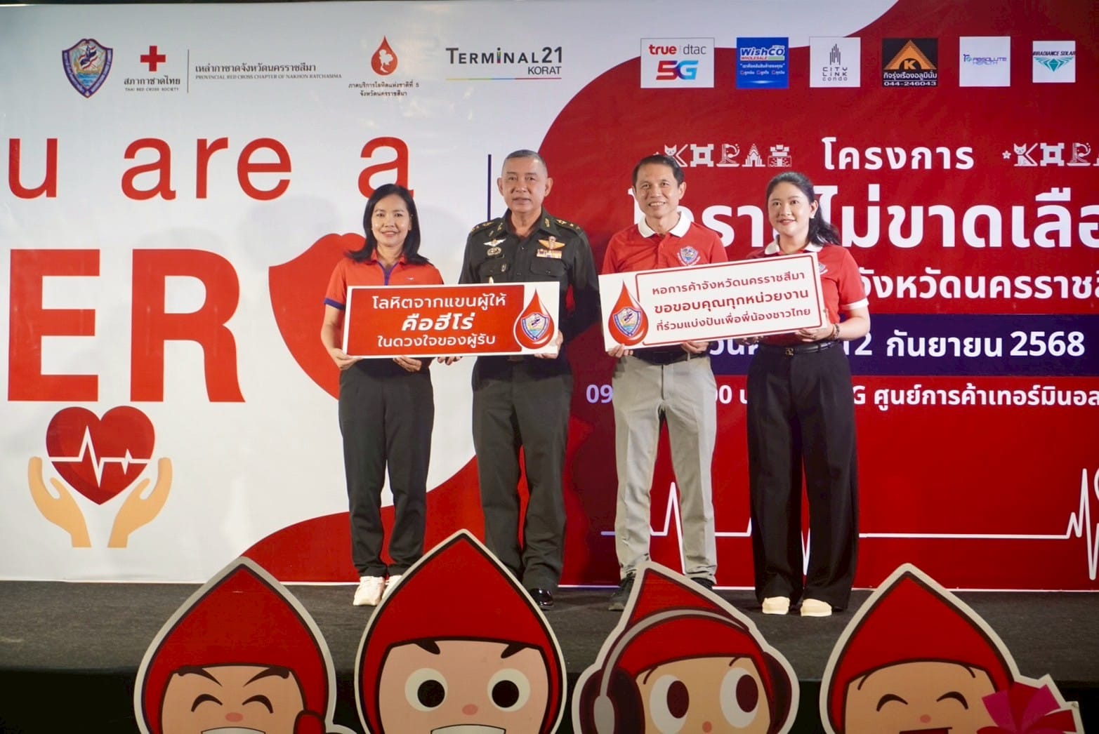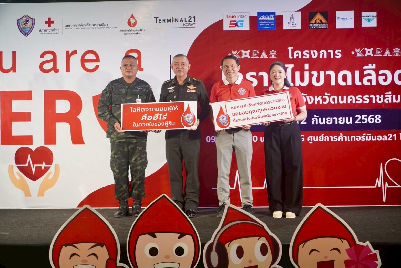 วันที่ 12 กันยายน 2568 ณ ชั้น LG ศูนย์การค้าเทอร์มินอล 21 โคราช หอการค้าจังหวัดนครราชสีมา ร่วมกับ เหล่ากาชาดจังหวัดนครราชสีมา ภาคบริการโลหิตแห่งชาติที่ 5 จังหวัดนครราชสีมา หน่วยงานภาครัฐ ภาคเอกชน ผู้ให้การสนับสนุน จัดกิจกรรมบริจาคโลหิต ภายใต้โครงการ “โคราชไม่ขาดเลือด” ครั้งที่ 3/2568 เพื่อรณรงค์เชิญชวนประชาชนร่วมเป็นผู้ให้ด้วยการบริจาคโลหิต ช่วยเหลือเพื่อนมนุษย์ และสร้างความมั่นคงด้านปริมาณโลหิตสำรองให้เพียงพอต่อการรักษาพยาบาลในโรงพยาบาลเครือข่ายทั่วจังหวัดนครราชสีมา และ จังหวัดใกล้เคียง.ภายในพิธีได้รับเกียรติจาก พันเอกสาธิต อุ่นกาย รองผู้บัญชาการมณฑลทหารบกที่ 21 เป็นประธานเปิดงาน พร้อมด้วย พันตำรวจเอกอดิศร สุวรรณรักษ์ รองผู้บังคับการตำรวจภูธรจังหวัดนครราชสีมา , นายไพจิตร มานะศิลป์ ประธานหอการค้าจังหวัดนครราชสีมา , คุณปพิชญา ณ นครพนม ผู้อำนวยการศูนย์การค้าเทอร์มินอล 21 โคราช , คุณศิริลักษณ์ เพียกขุนทด หัวหน้าภาคบริการโลหิตแห่งชาติที่ 5 สภากาชาดไทย ,นางสาวโสมรัชณู เครืออยู่ ประธานโครงการ “โคราชไม่ขาดเลือด” ครั้งที่ 3, คณะกรรมการหอการค้าฯ , หน่วยงานภาครัฐและภาคเอกชน , ผู้เข้ารับบริจาคโลหิต และ สื่อมวลชน เข้าร่วมงาน.โครงการ “โคราชไม่ขาดเลือด” จัดขึ้นเป็นประจำอย่างต่อเนื่อง เพื่อสร้างจิตสำนึกในการเป็น “ผู้ให้ที่ยิ่งใหญ่” และสร้างเครือข่ายอาสาสมัครผู้บริจาคโลหิตประจำ ซึ่งนับเป็นอีกหนึ่งกิจกรรมสำคัญที่ช่วยยกระดับคุณภาพชีวิตของประชาชนและเสริมสร้างความเข้มแข็งให้กับสังคมโคราชอย่างยั่งยืน โดยมีผู้เข้าร่วมบริจาคในครั้งนี้ 262 ราย ได้โลหิต 124 ยูนิตและบริจาคโลหิตในครั้งถัดไป วันที่ 12 ธ.ค. 68 ณ ชั้น LG ศูนย์การค้าเทอร์มินอล 21 โคราช