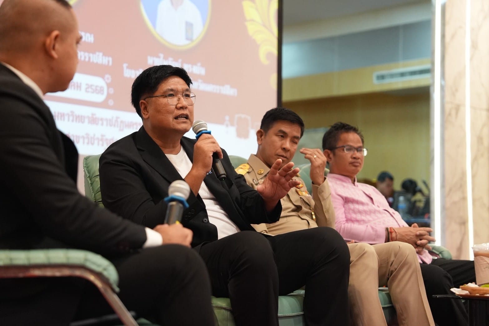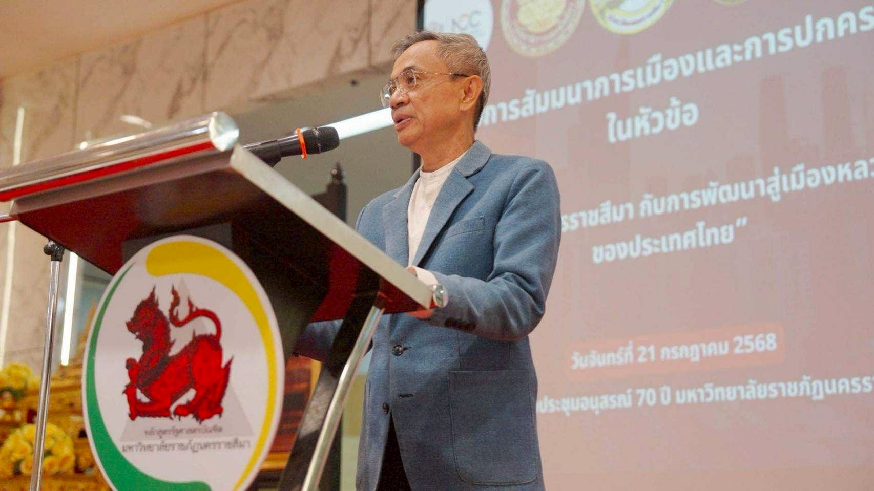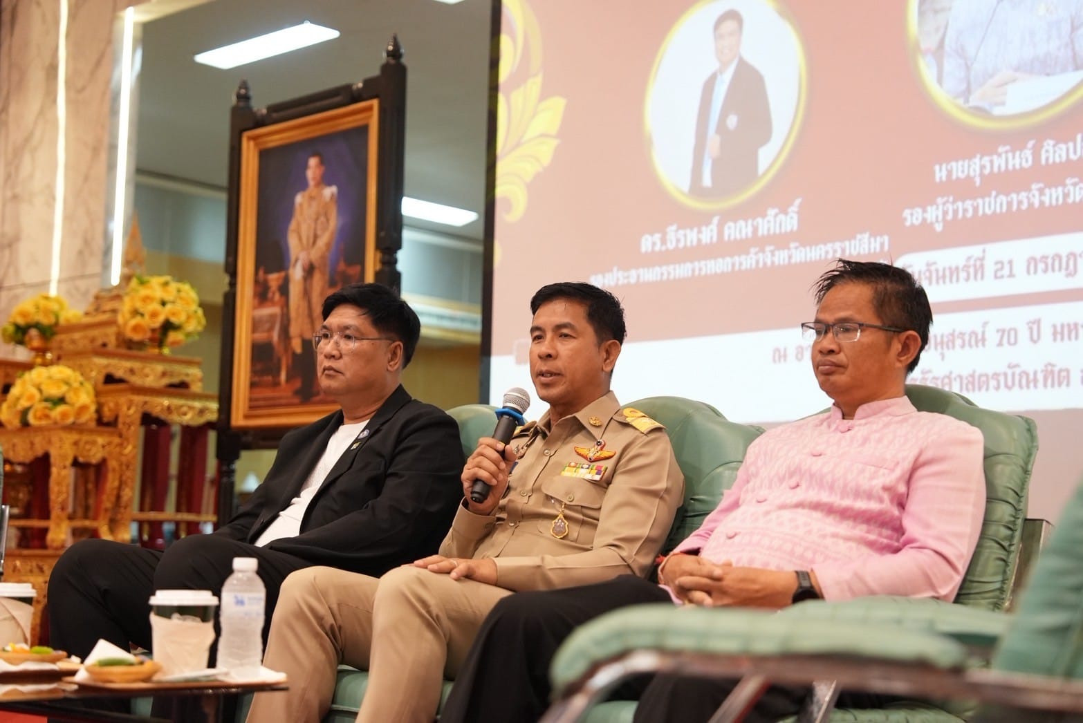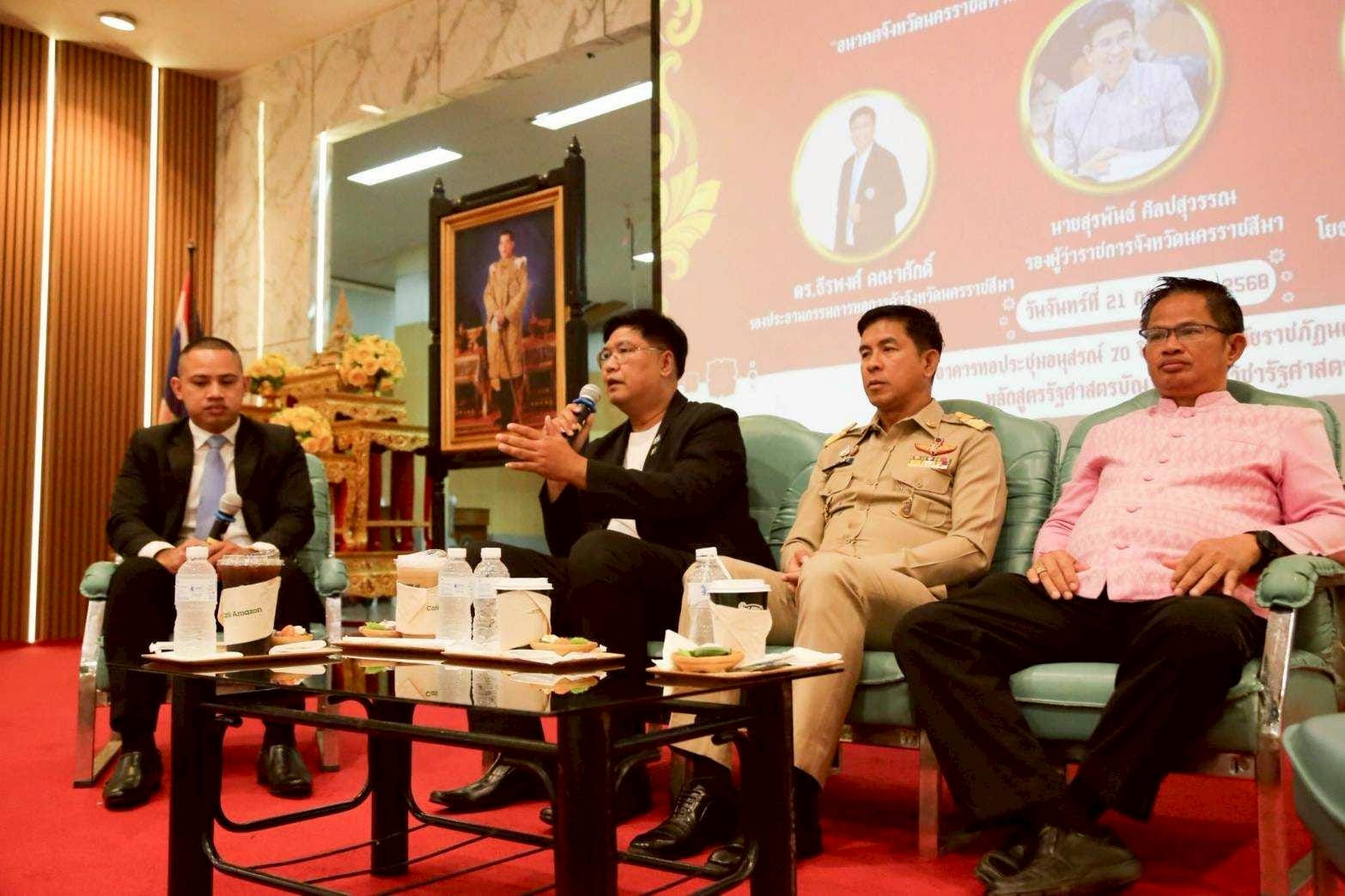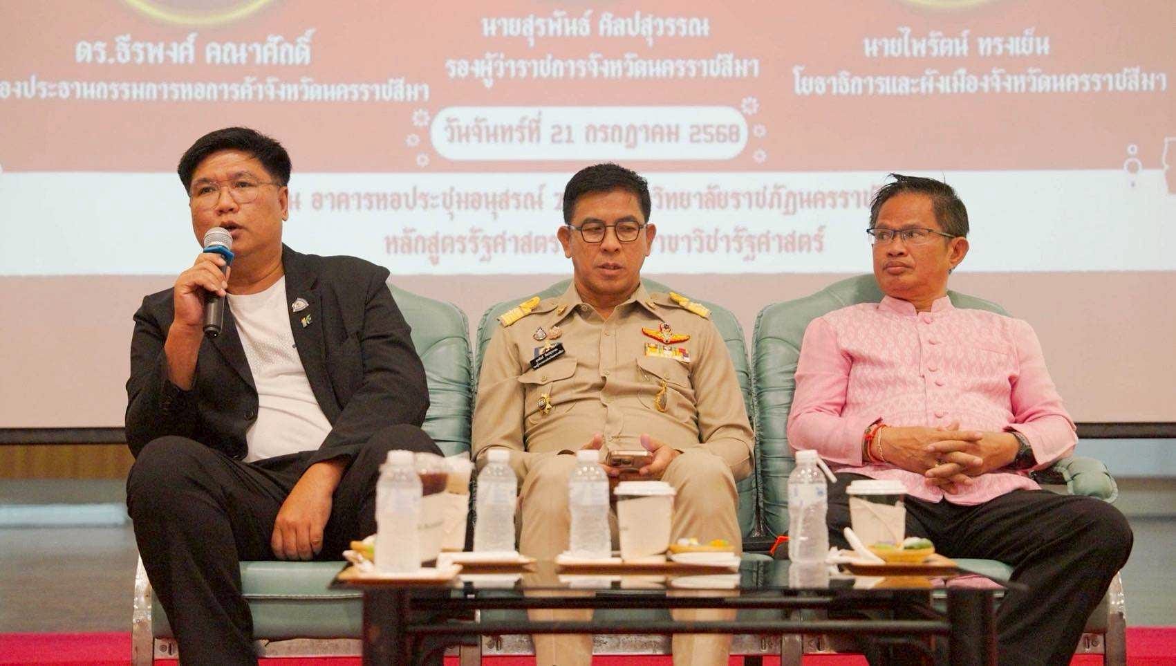 วันที่ 21 ก.ค. 68 ที่อาคารหอประชุมอนุสรณ์ 70 ปี มหาวิทยาลัยราชภัฏนครราชสีมา ดร.ธีรพงศ์ คณาศักดิ์ รองประธานฝ่ายบริหารและสื่อสารองค์กร หอการค้าจังหวัดนครราชสีมา ได้รับเกียรติเป็นวิทยากรเสวนาพิเศษใน โครงการสัมมนาทางการเมืองและการปกครอง ซึ่งจัดขึ้นเพื่อเปิดเวทีแลกเปลี่ยนความคิดเห็นด้านนโยบายและทิศทางการพัฒนาพื้นที่ระดับจังหวัด โดยมีหัวข้อการเสวนาเรื่อง “อนาคตจังหวัดนครราชสีมากับการพัฒนาสู่เมืองหลวงแห่งที่ 2 ของประเทศไทย”.การเสวนาครั้งนี้จัดขึ้นโดยมีวัตถุประสงค์เพื่อให้ผู้นำภาคส่วนต่าง ๆ นักวิชาการ นักศึกษา และประชาชนทั่วไป ได้ร่วมกันสะท้อนความคิดเห็น วิเคราะห์ศักยภาพของจังหวัดนครราชสีมา ทั้งด้านโครงสร้างพื้นฐาน เศรษฐกิจ การศึกษา และสังคม ตลอดจนร่วมกำหนดยุทธศาสตร์การพัฒนาในอนาคต