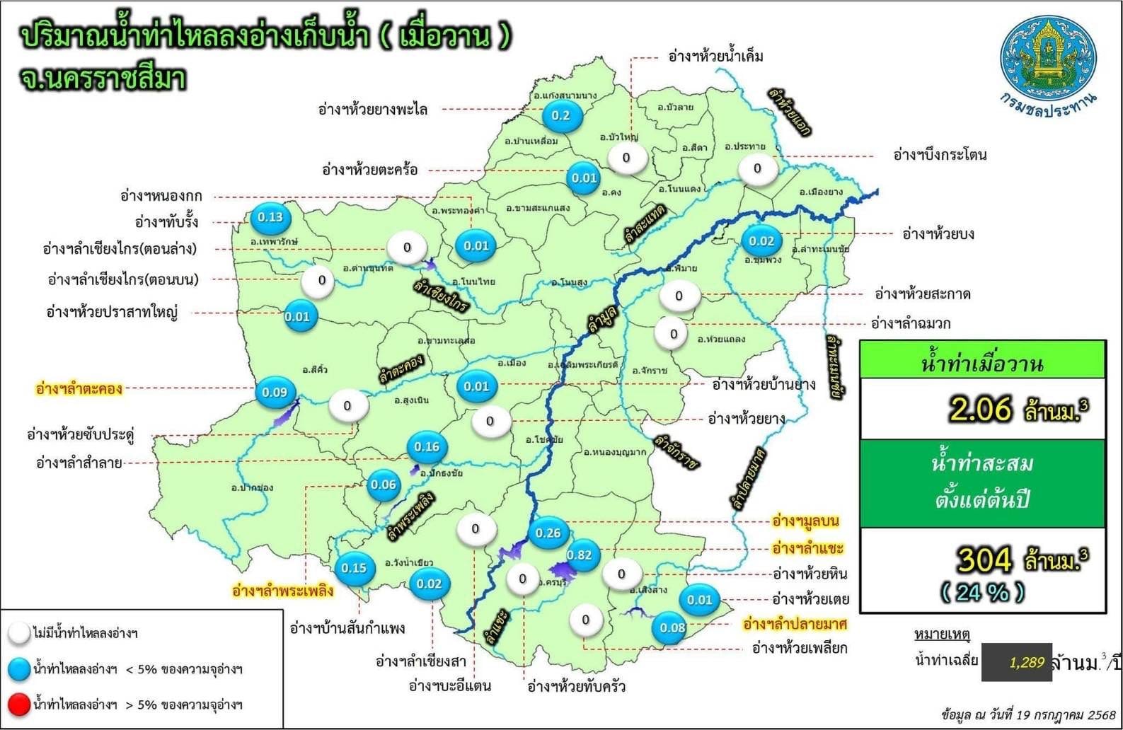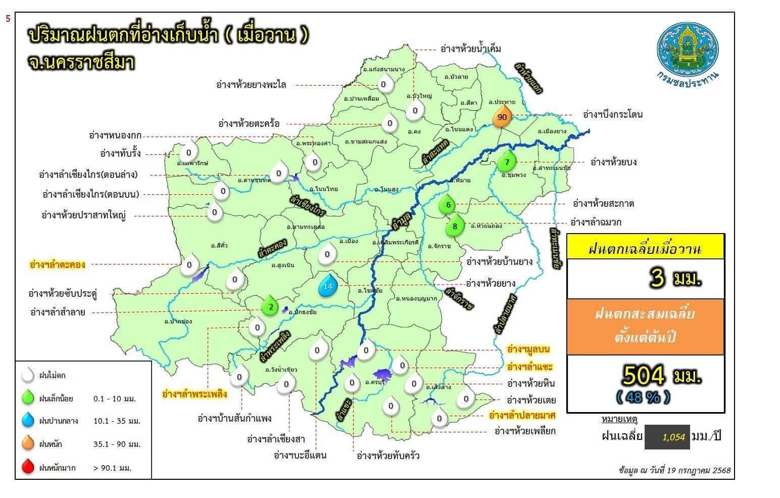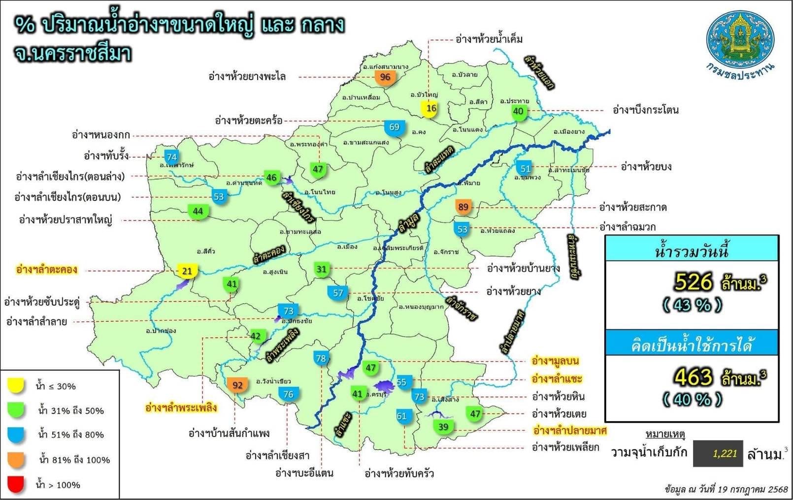 จากแผนที่แสดงสถานการณ์น้ำในอ่างเก็บน้ำขนาดใหญ่และขนาดกลาง จังหวัดนครราชสีมา ณ วันที่ 19 กรกฎาคม 2568
