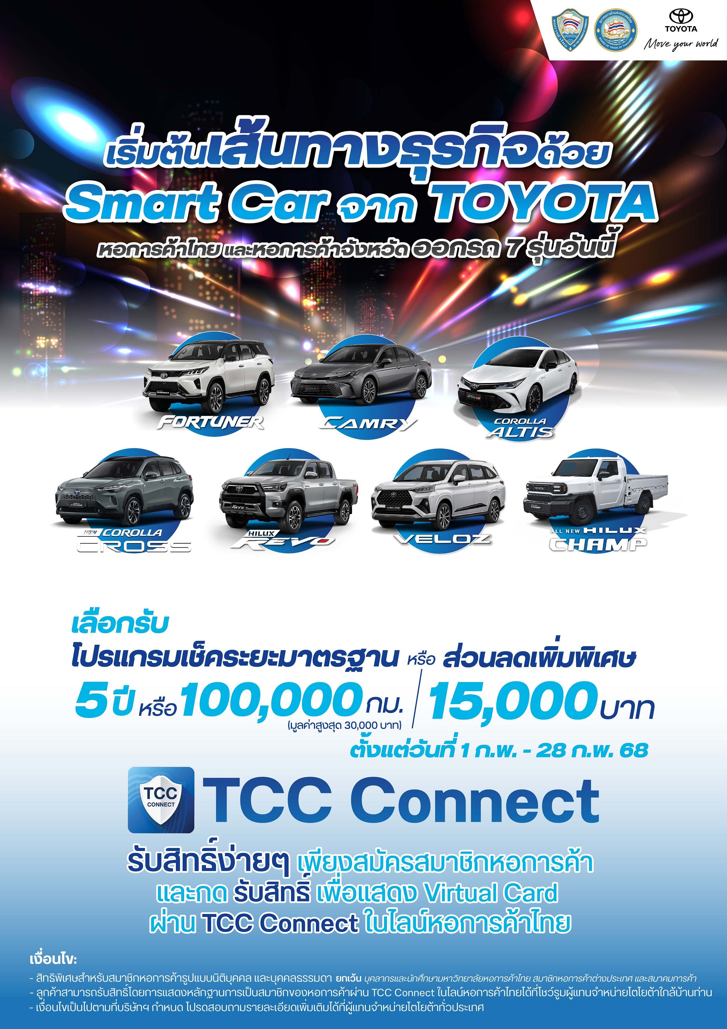 - ลูกค้าสามารถรับสิทธิ์โดยการแสดงหลักฐานการเป็นสมาชิกของหอการค้า ผ่าน TCC Connect ในไลน์หอการค้าไทย ได้ที่โชว์รูมผู้แทนจำหน่ายโตโยต้าใกล้บ้านท่าน